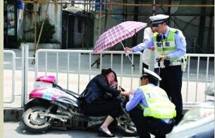 江苏镇江交警发现一名女子骑车逆行,便上前指出其违法行为,谁知女子非但不配合,还在路口哭闹并大喊“警察打人了!”。因情绪激动,居然中暑了……交警赶紧为其撑伞,同时拨打120急救。