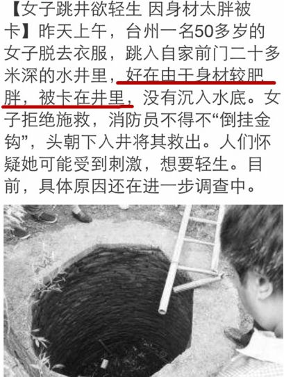 胖子们,感受到这个世界满满的恶意了没...①女子跳井欲轻生,因身材太胖被卡住;②240斤男子抢车逃跑中压爆车胎 成警方破案重要线索;③胖子容易被蚊子“盯上”!