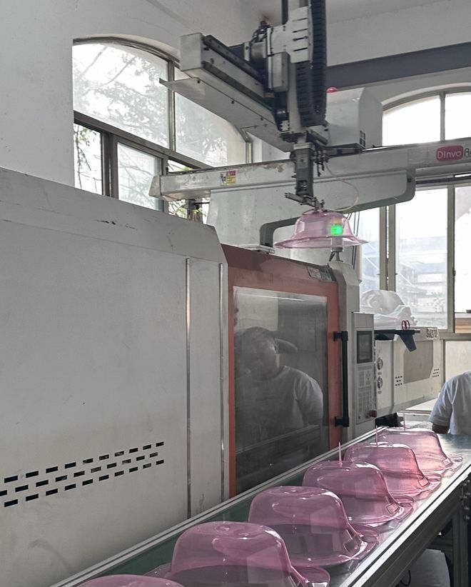 工作日的下午,义乌丁店村一座两千平米的工厂深处,一排注塑机轰隆作响,空气中有新塑料加热后的气味。一大袋粉色的 pc 颗粒灌入注塑机,仅需十来秒,就变成一个个带蝴蝶结形状的马桶坐浴盆,再由机械臂取走放置在传送带上,最终整齐地码在箱子里。