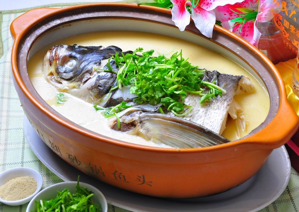 天目湖的做法:江浙的鱼头汤首选天目湖的鲢鱼,比其他养殖的鱼颜色深,个头大,鱼腥味淡,鲜味足。鱼头入锅,加水、植物油、料酒、姜片、香菇和竹笋片,炖 45 分钟即成。上桌前放入胡椒粉和一大把香菜去腥。因为和其他做法的鱼头汤看起来很不同,特意配张图。在天目湖边喝鱼头汤,就是这样的土砂锅端上桌。