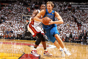 总决赛第二场,诺维茨基完成了生涯第五记“生死时刻”的进球,追平詹姆斯的5记。