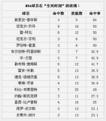 从1996-97赛季至今的“生死时刻”球员表现榜上,乔丹是唯一一个在出手18次以上,命中率达到5成的球员。现役只有科比的出手次数比乔丹多,但是命中率仅有28%。数据来源:ESPN