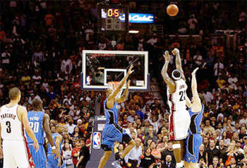 看看2011年总决赛的情况,克里斯-波什在第三场左侧底线的反超一球?比赛时间所剩太多;贾森-特里在第五场的超级三分球?他所在的球队正领先。这两个进球都不能算。只有5个进球属于我们讨论的范畴:马里奥-钱莫斯在第二场还剩24秒时的扳平三分球;诺维茨基在第二场还剩3.6秒时的上篮;韦德在诺维茨基上篮后错失的三分球;诺维茨基在第三场最后时刻错失的中投;迈克-米勒在第四场想要扳平比分的“三不沾”。