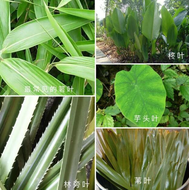 包粽子的工艺全国各地的方法都不一样。先说叶子,大部分地区是用箬竹的叶子包粽子,也有用苇叶、柊叶、芋头叶、荷叶以及芦兜叶等。用植物叶子包裹主要的作用有三:一是通过包裹和蒸煮,使内瓤吸收植物中清香的味道;二是延长食物的食用期限;三是赋予粽子好看的造型。