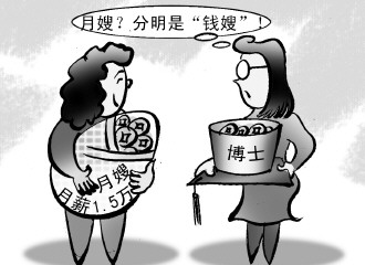 据媒体调查,北京、上海收费最贵的月嫂,月薪已超过1.5万元,其人力成本远高于一个经过多年专业培训的医学博士。对此,有专业人士认为,“天价”月嫂现象主要由当代产妇对婴儿护理常识匮乏,以及月嫂公司夸大月嫂服务的专业性两种因素造成(4月10日《新京报》)。