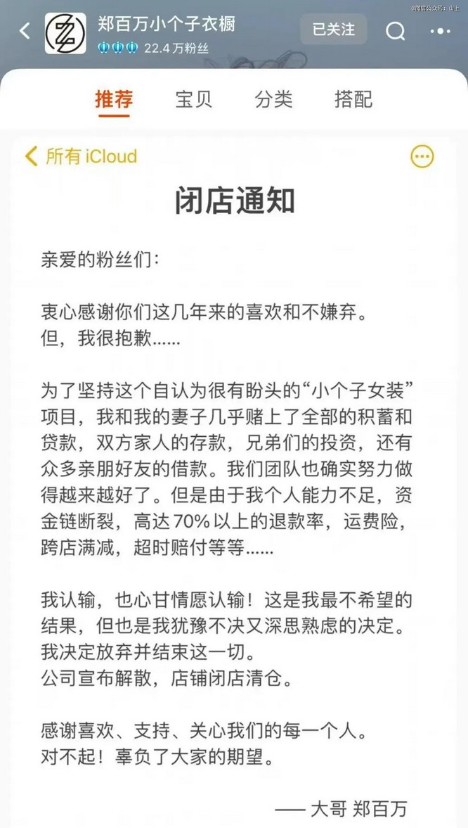 9 月底,我在自己的淘宝女装店铺 “郑百万小个子衣橱” 发了一篇通告,宣布解散闭店,正式告别了自己从事 15 年的电商服装行业。