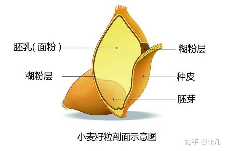 种皮和胚乳之间的糊粉层,通常因为和种皮粘连而成为麸皮。在物理上很难将糊粉层和种皮完全剥离。