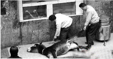 这道菜也是和驴过不去,活驴固定好,旁边有烧沸的老汤。食用者指定要吃某一部分,厨师剥下那一块的驴皮,露出鲜肉。用木勺舀沸汤浇那块肉,等浇得肉熟了再割下来,装盘上桌。