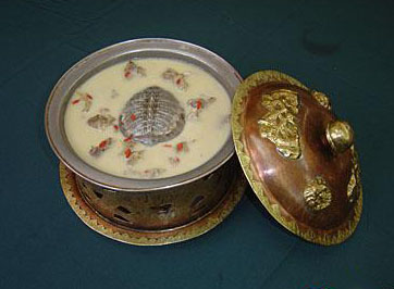 铁板甲鱼:将鲜活的甲鱼放在有调料的凉汤中用慢火煨。甲鱼是活的,当水渐渐升温后,甲鱼就会因为热而喝汤,调料自然就进入了甲鱼的体内。渐渐火越来越热,看着锅中甲鱼痛苦的翻滚,举箸之人无不兴奋异常。最后甲鱼熟了时,外面的汤和甲鱼喝下的汤,使甲鱼肉味中都有汤的味道,据说鲜美无比。