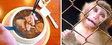 猴头:这里说的猴头绝不是食用菌猴头,而是真正的猴脑。一个中间挖洞的方桌,几个人围桌而坐,中间的洞并不象火锅或是麻辣烫那么大,正好容一只猴子的头伸出。一只非常可爱的猴子牵出,据说那是专门食用的猴儿,头比较大。猴儿的头顶从小洞中伸出,用金属箍住,并且箍的非常紧,用小锤轻轻一敲,头盖骨应声而落。猴的脑部就完全裸露在食客们的面前。这时,有较馋一些的人,已经用汤匙升向红白相间的猴脑,随着桌下垂死猴子一声惨叫,拉开了生食猴脑惨状的序曲