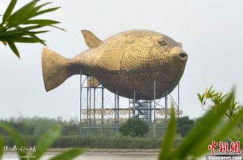 金光灿灿,摇头摆尾,一条“河豚”跃出水面—这个巨型雕塑是扬中的新地标,也是第八届江苏园博会的重要标志。这条巨型“河豚”一亮相,便引起网上热议,网友质疑,投7000万元巨资兴建这样一个地标值吗?(南都报9月28日)