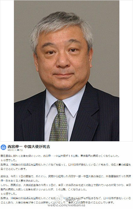 @开心myhanks:日本候任驻华大使西宫伸一去世,难道是给驻华大使这个职务活活吓死的?才60岁……