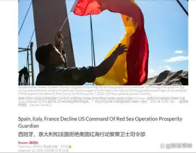 这两天我在上网的时候刷到了一条十分耐人寻味的新闻,原始信源是英国的路透社,说是由于“种种原因”,原先被美国防长奥斯汀硬生生给塞到所谓的“繁荣卫士行动”里头的法国、意大利和西班牙,如今均已明确表示,拒绝美方的“盛情邀请”。法意西三国或计划派遣各自的军事力量前往红海参与护航行动,但是它们的护航行为和美国人主导的“繁荣卫士行动”并没有直接关联,三国和美国也不是从属关系。