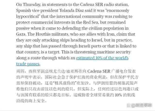 不只西班牙国防部,当地时间12月21日,西班牙副总统尤兰达·迪亚斯(Yolanda Díaz)也通过西班牙广播公司(Cadena SER)发表了一份言辞堪称激烈的声明。她表示,国际社会急于保护红海的商业利益,但在保护平民方面却依旧无所作为,这种做派无疑是“极其虚伪的”,尤其是对加沙那些还在受苦受难的巴勒斯坦人民而言。