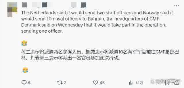 “荷兰说他们将派遣两名参谋,挪威说他们将派遣10名海军军官,丹麦说他们将派出一名官员。简直笑死,你们怕不是就是那群传说中的猴子请来的救兵吧?”