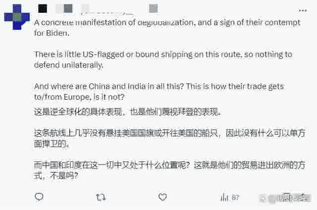 “家人们,这就是我常跟你说的逆全球化啊,这就是人家藐视拜登政府的表现啊。走红海航线的船只几乎就没有悬挂美国国旗的,也少有开往美国的,所以说实话,那里其实没什么值得我们美国去单方面捍卫的。这事明明就该中国和印度冲在最前头才对的,他们才是取道红海同欧洲贸易的最大获益者,不是吗?”