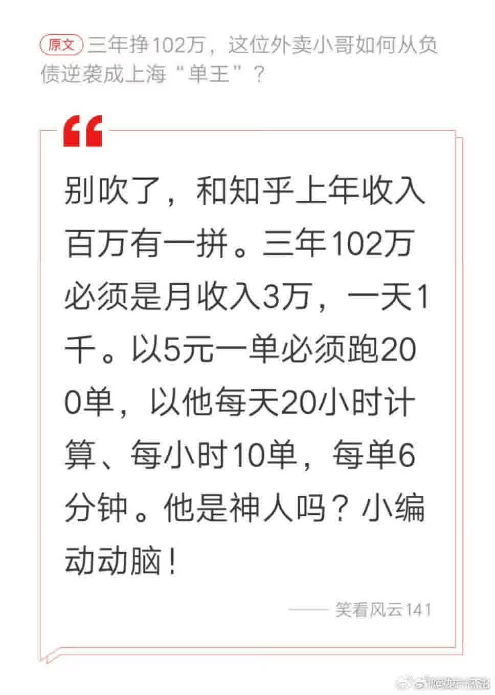 365×3=1095 天;1020000/1095=931.50;931/16 小时 = 58 元。一个小时能送多少单?而且订单也不大可能源源不断。因此,我怀疑这又是一则 “励志” 故事。