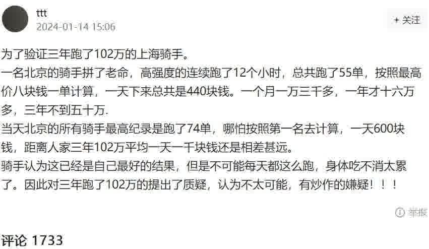这时间除了少数网民较真外,还有专业人士及同行较真。为了验证三年跑了 102 万的上海骑手。一名北京的骑手拼了老命,高强度的连续跑了 12 个小时,总共跑了 55 单,按照最高价八块钱一单计算,一天下来总共是 440 块钱。一个月一万三千多,一年才十六万多,三年不到五十万。