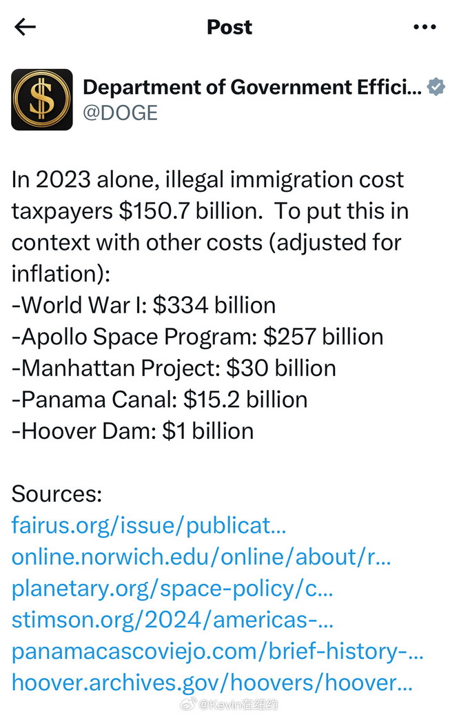 @Kevin 在纽约:「美国仅 2023 年一年内,马斯克负责的川普 2.0 政府效率部(DOGE),官方帐号 12/3 日发帖写道:「光是在 2023 年里,非法移民就花掉美国纳税人 1507 亿美元。」 并给出了数据来源。这 1507 亿美元什么概念?马斯克列了一个清单,与其他大项目的开支对比(按今天通胀调整后数据)。