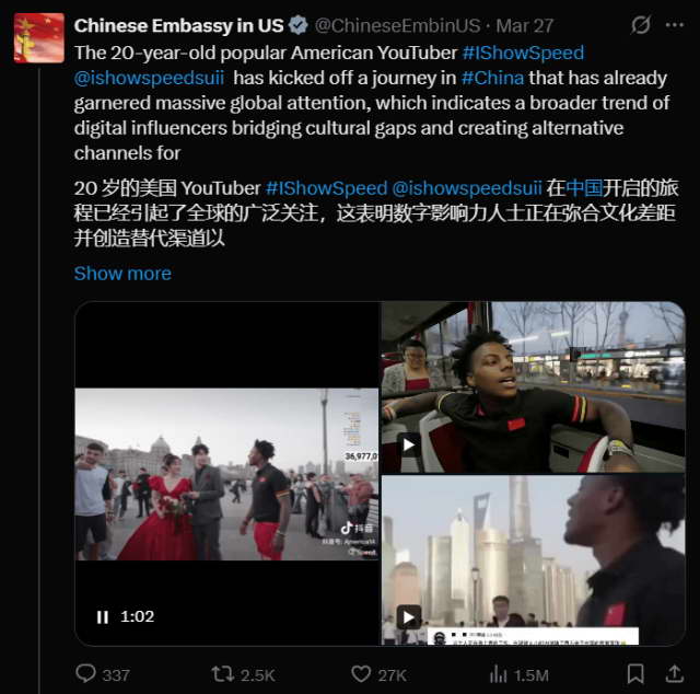 我觉得最重要的,其实还不是基建、国家实力,而是破除了欧美国家对东亚年轻人的刻板印象:原来中国人很多人英语都蛮好的,并不像想象中那么闷,都很懂梗,也很会玩,整起抽象来不虚全世界。