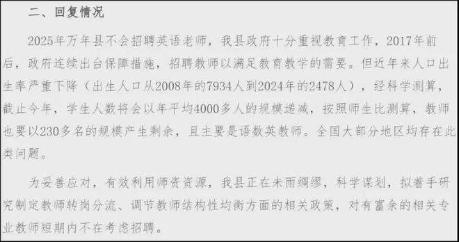 里面,万年县政府办说 2025 年将暂停英语教师招聘,理由是:他们科学测算出学生规模将逐年缩减、教师规模将剩余。