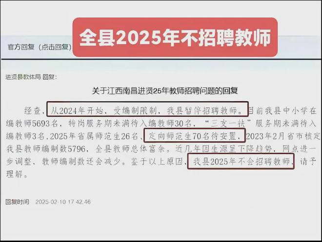 江西进贤县更进一步,2025 年直接暂停教师招聘。理由还是生源下降。