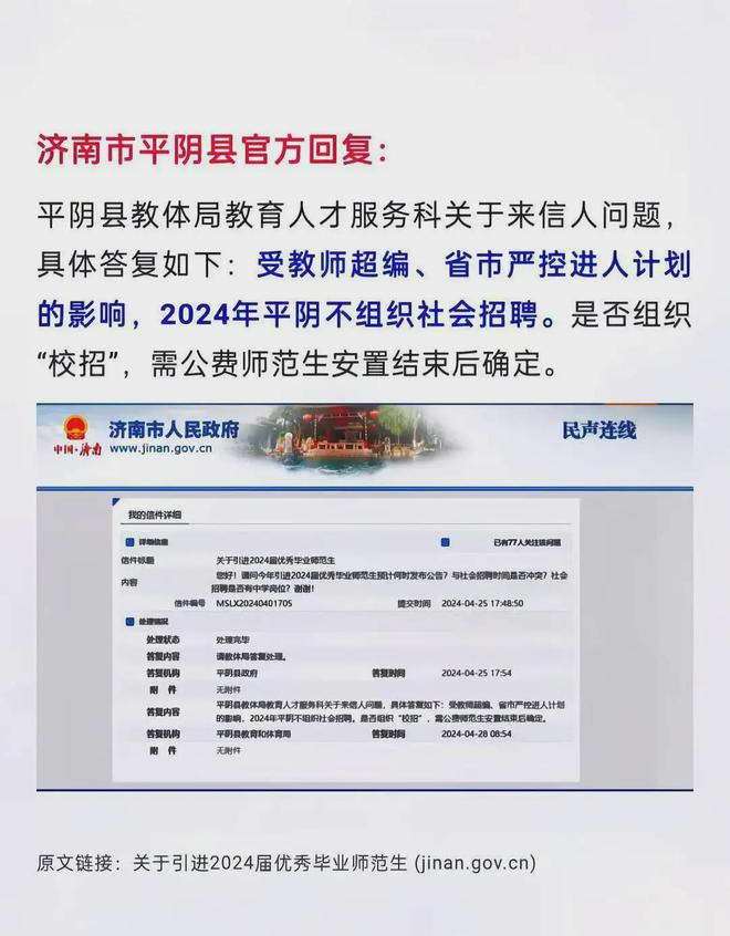 济南市平阴县说受教师超编、省市严控进人计划的影响,2024 年不组织社会招聘。