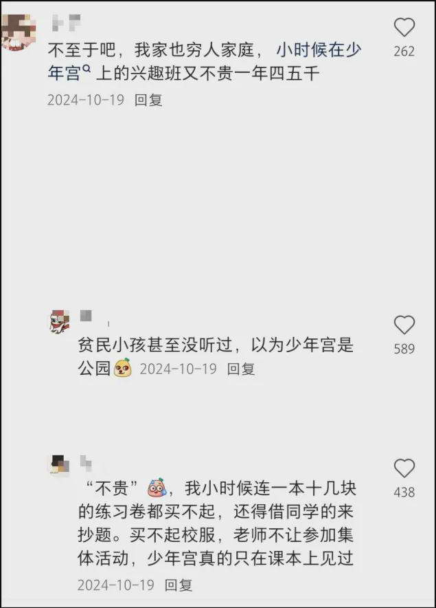 你表示,我小时候去少年宫上兴趣班,一年也就花四五千,不贵啊;他会反驳,我当年买不起教辅,更没听过少年宫三个字。