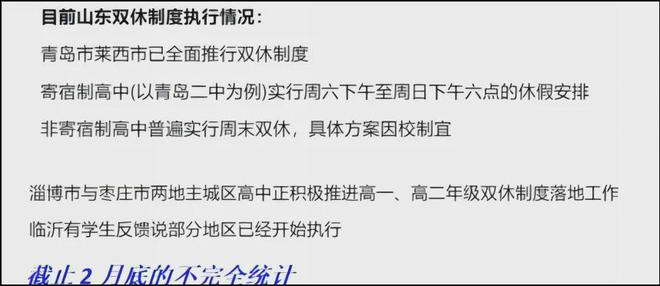 浙江杭州高一、二年级全面停止周末返校; 江苏扬州、南通等地高一、高二实行双休,高三调整为单休; 山东多所高中宣布实现双休。