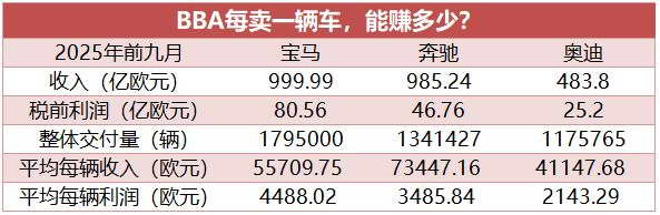 而奔驰、奥迪每交付一辆车的税前利润分别为 3486 欧元、2143 欧元。