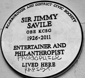 萨维尔住所外的纪念牌已被人涂画上了“强奸犯”“娈童癖者”的字样