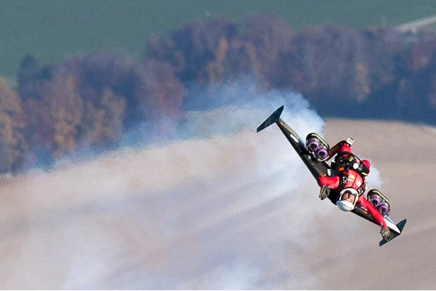 3. 51岁的瑞士探险家罗西(Yves Rossy)利用自制的“飞行器”——一件充了气的翼服在日内瓦湖上空约2400米的高度飞了两圈。