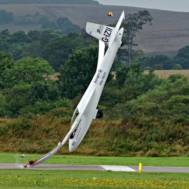 7. 图为今年10月份在英国西萨塞克斯郡肖勒姆镇举办的英国皇家空军协会航空展中,一架特技滑翔机因故障坠地。这一幕也吓坏了现场15000名观众。但幸运的是,该机飞行员大难不死,飞机坠地后自己还爬出了滑翔机残骸。