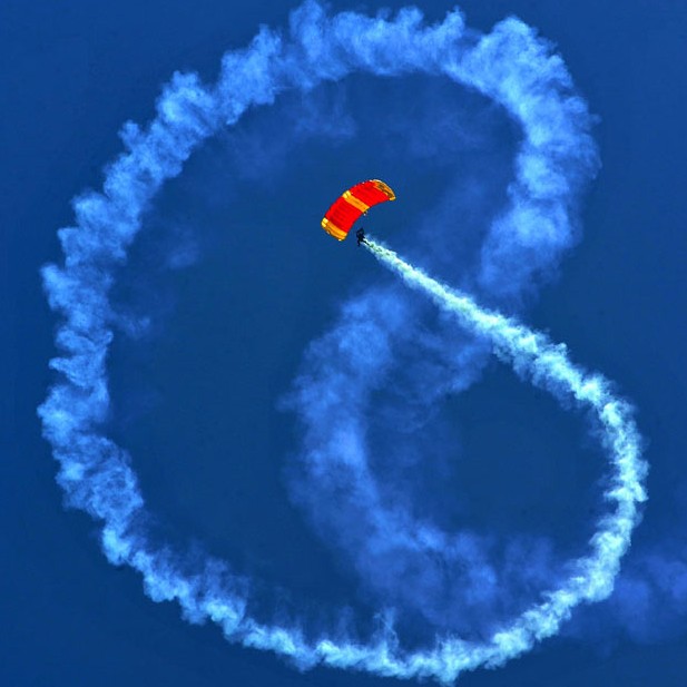 10. 在哥伦比亚西部城市卡利举行的一次年度航空航天飞行表演会上,一名跳伞兵正在尝试用烟雾画数字图形。