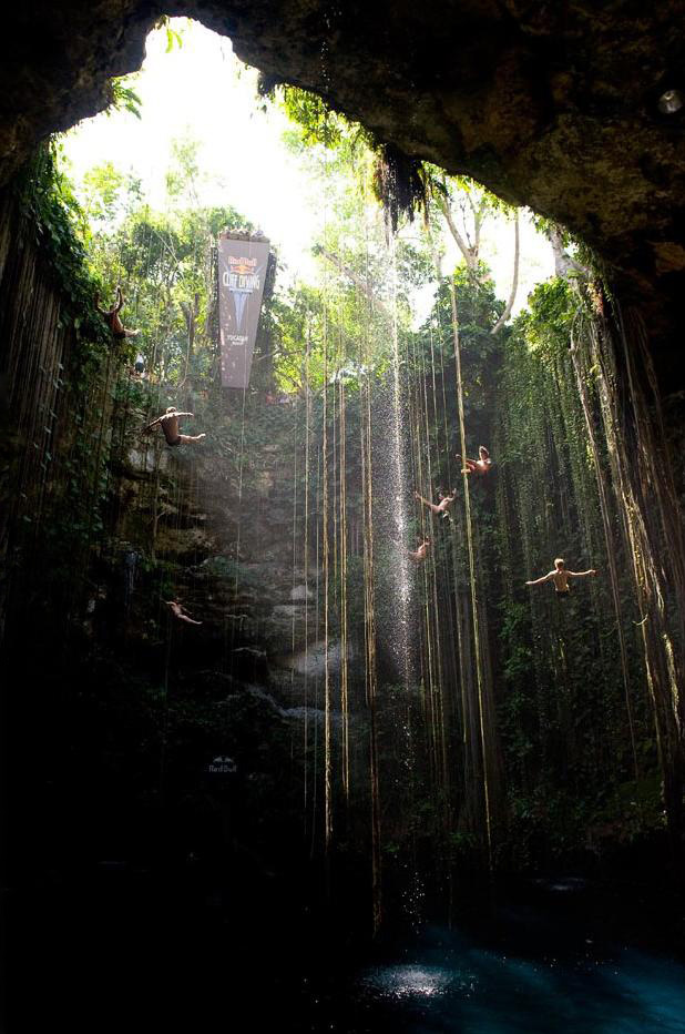 13. 这是悬崖爱好者在墨西哥东南部尤卡坦半岛上演的惊险坠崖一幕。