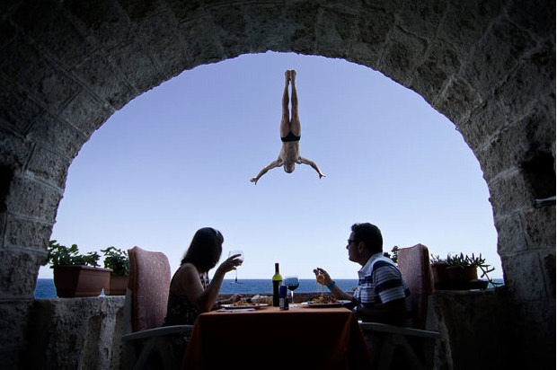 14. 这是在意大利语滨海波利尼亚诺上演的2010红牛悬崖跳水赛事中,一名男子从露台跳下去,当时在下方正由一对情侣用餐,观赏了这一幕。