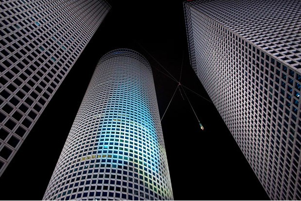 16. 以色列魔术师迪安(Hezi Dean)在做“亡命表演”。在特拉维夫,他把自己绑吊在三座摩天大楼之间的绳子上,最后还成功解脱。