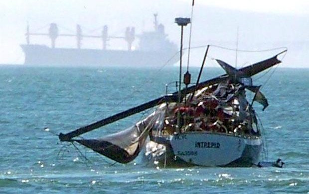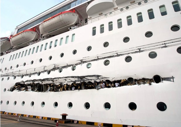 28. 挂着意大利国旗的一艘游轮在上海与一艘货轮相撞。这是船上的乘客在从船的裂缝中向外观望。