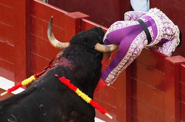 21. 西班牙一头公牛跟着赶牛的人一起不小心跃入大海中。