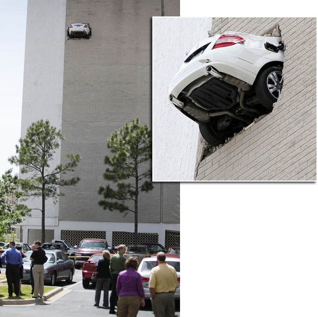 27. 美国俄克拉何马州一辆车被“挂在”七楼的墙上。原因是此车司机倒车时不小心穿透了墙。