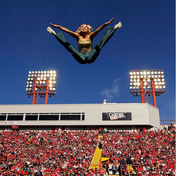 30. 加拿大一场足球赛中一名拉拉队员正在做空中表演。