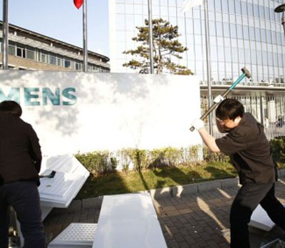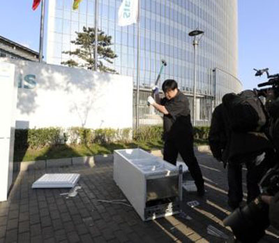 人民网11月23日电 (记者许博)据媒体报道,11月20日上午老罗英语培训创始人罗永浩,在西门子公司北京总部大楼外,公开砸毁3台西门子冰箱,其中一台是罗永浩的,另两台属音乐人左小祖咒和作家冯唐 。据悉从9月起罗永浩发微博称“冰箱门关不严”,“砸冰箱是为敦促西门子回应改正”。
