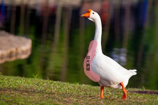 原因在于,这个地方的绒毛经常浸在水中,具有一定的防水性,而且羽梗少,非常柔软,纤维长而蓬松度高,这种绒毛,可以说是鹅绒王中王。