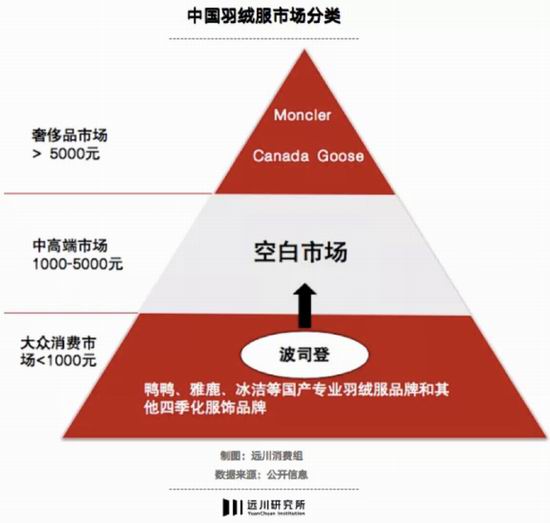 只是,如果将中国羽绒服市场模拟成一座金字塔,波司登仅仅是从."底部".提升到了."腰部",从."大众消费市场",提升到了."中高端市场",距离."顶部".的奢侈级羽绒服仍然有很大差距。