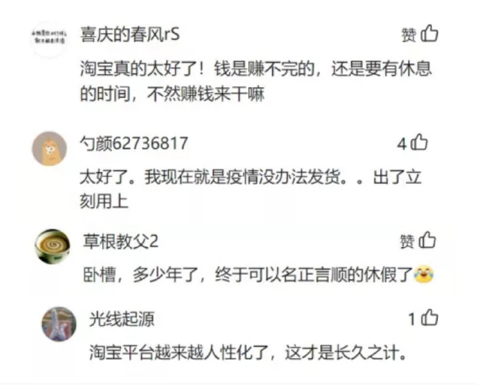 据他说,很多同行都跟他有一样的想法,因为今年淘宝推出了 “节假日一键打烊” 工具,允许商户自己选择打样,每年两次,每次最长一个月。打烊期间,商品不会被下架和降权。