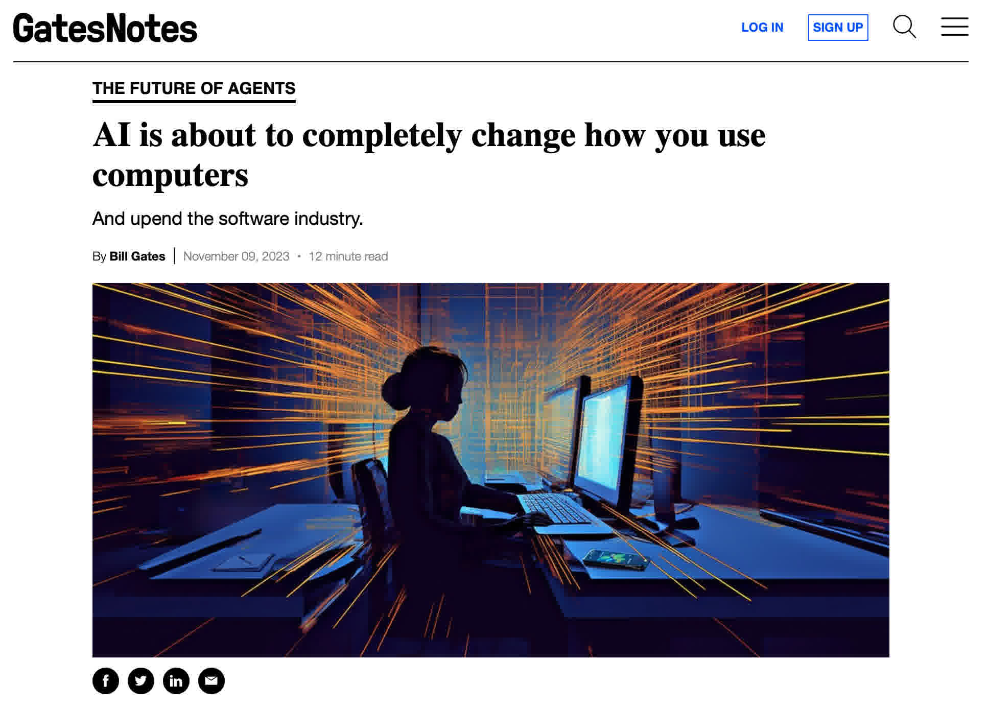 也许是受 OpenAI 新动作的影响,盖茨随后发表标题为《人工智能即将彻底改变你使用计算机的方式 —— 并颠覆软件行业》的文章,进一步详细描绘了智能体到底会如何改变我们生活的方方面面,以及未来所面临的技术和社会挑战。以下为这篇文章的全文:
