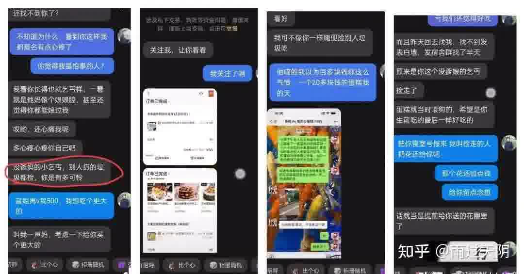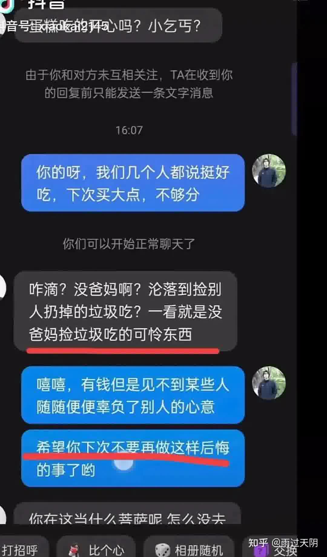 扔蛋糕的女生看到视频后私信男同学,骂他是“没爸妈捡垃圾吃的可怜东西”。