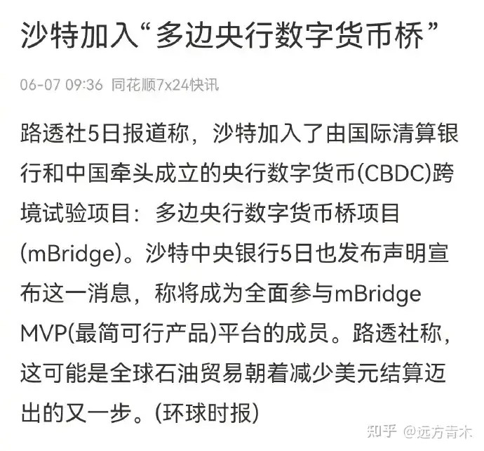 6月8日是石油美元协议的到期日,而沙特在决定不再和美国续签协议的前一天,也就是6月7日,宣布加入中国和国际银行牵头成立的“多边央行数字货币桥”。