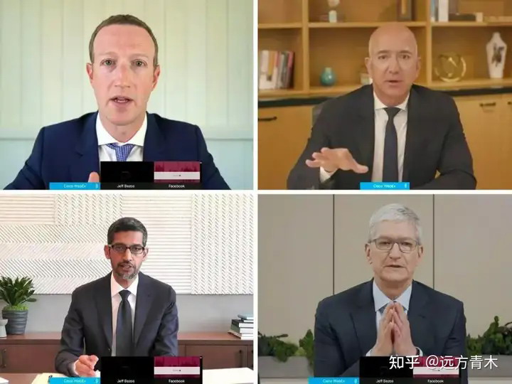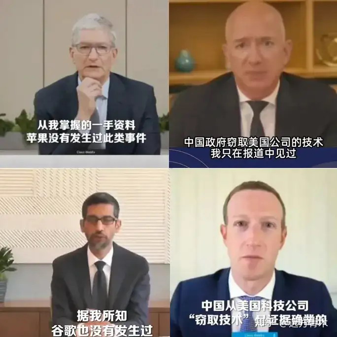 2020年美国听证会上,四大美国科技巨头的CEO被问及“中国是否剽窃美国技术时”。