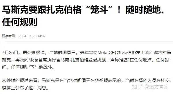 7月24日,马斯克再次对Meta公司首席执行官扎克伯格发起笼斗邀约,声称准备“在任何地点、任何时间、任何规则”下与他战斗。